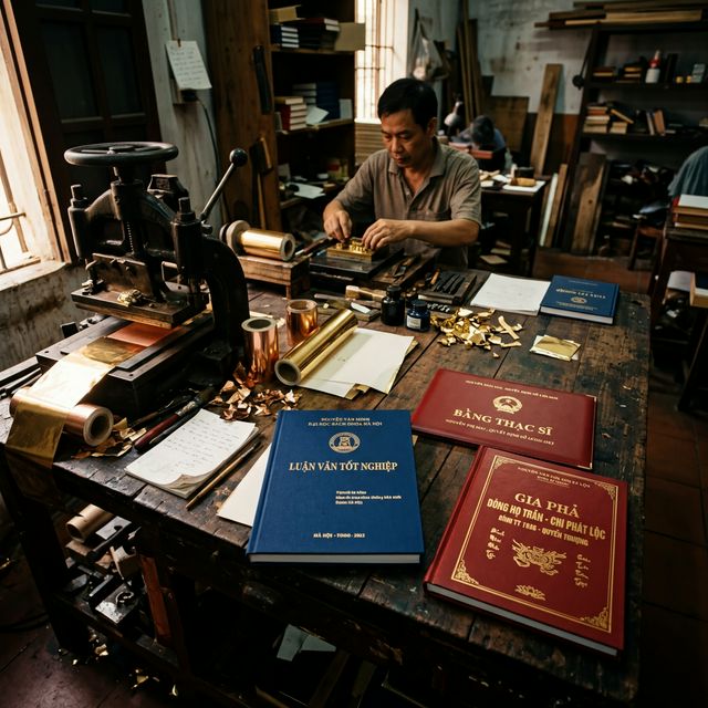 Đối với hội đồng chấm thi, cái nhìn 10 giây đầu tiên mang lại hiệu ứng hào quang (Halo effect) cực kỳ mạnh. Khi bạn bước lên bục bảo vệ, trao cho giảng viên một quyền đề tài được bọc bìa mạ vàng nhám cao cấp, với logo trường khắc nhũ kim phát sáng, thầy cô lập tức đánh giá bạn có quy trình làm việc chuyên nghiệp. Mực in kim loại chịu nhiệt không chỉ giữ bề mặt trường tồn như vàng 9999 mà còn tăng đáng kể điểm số hình thức bảo vệ đồ án của bạn!